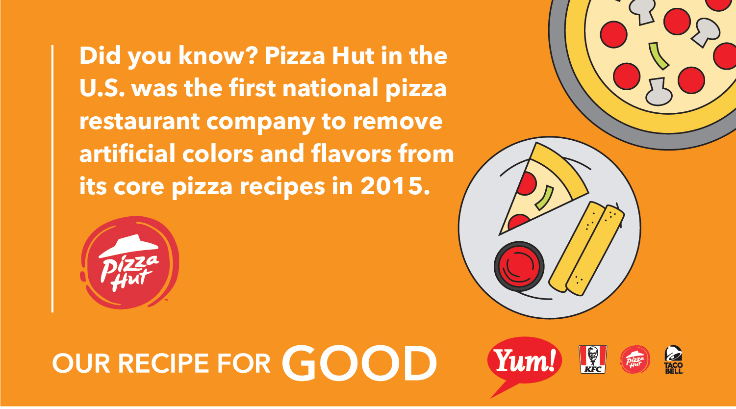 In 2015, Pizza Hut US became the first national restaurant chain to remove artificial colors and flavors from its core pizza recipes. Learn more about how Yum! and its three iconic brands, KFC, Pizza Hut and Taco Bell, are becoming more transparent about their ingredients in the 2017 Global Citizenship & Sustainability Report.