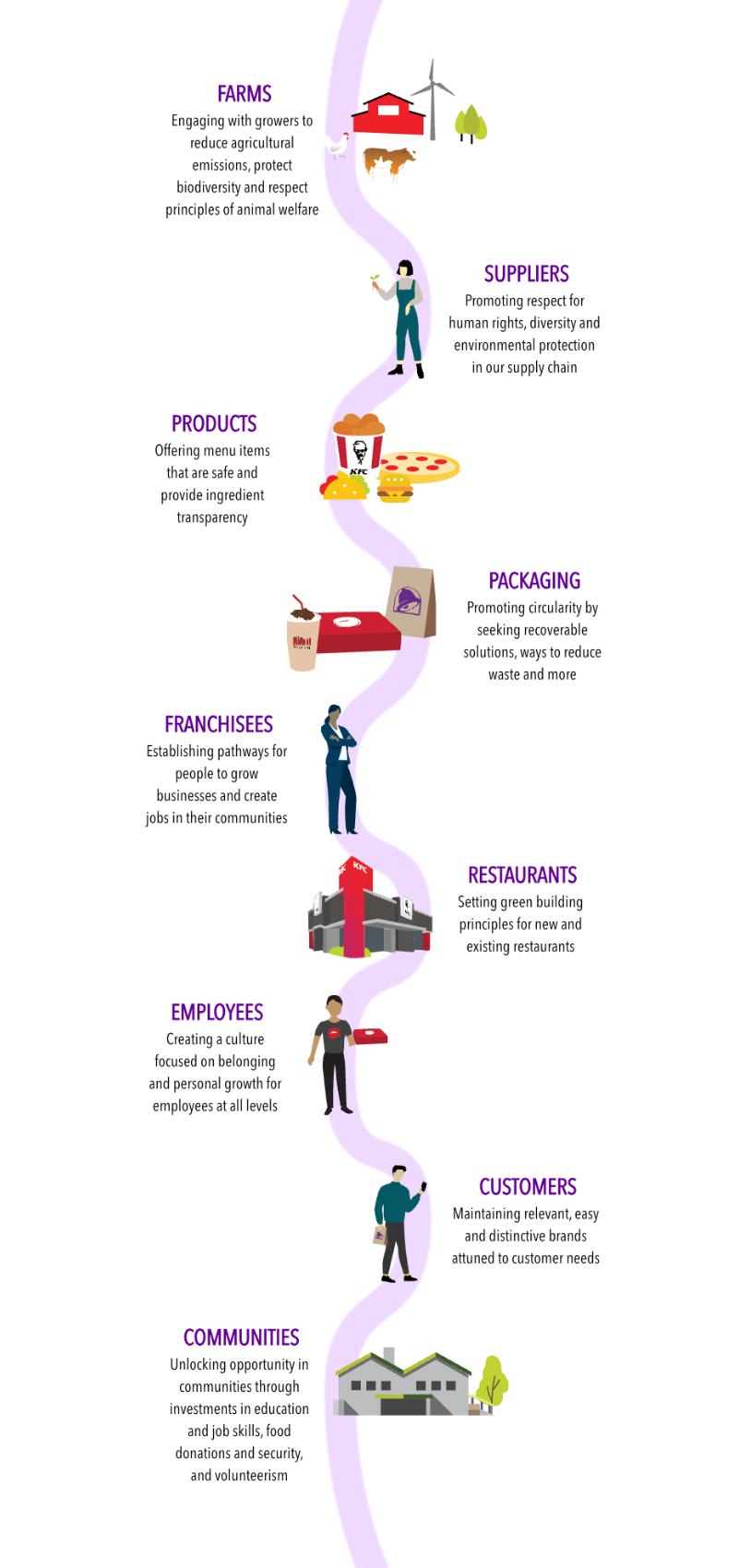 Most people know Yum! through our iconic brands: KFC, Taco Bell, Pizza Hut and Habit Burger & Grill. While our restaurants—and the people who work in them—are the heart of our business, our full impact ranges further. Here’s a look at the ways we make an impact across our value chain:
